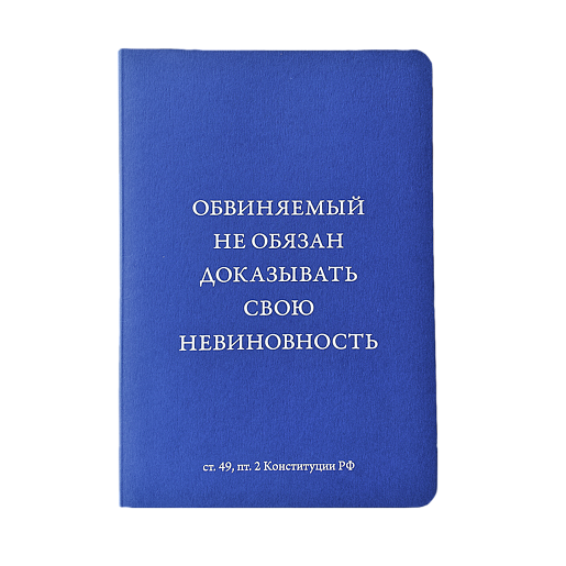Блокнот А6 с цитатой «Обвиняемый не обязан доказывать свою невиновность» из статьи 49.2 Конституции Российской Федерации.