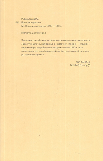 Задача настоящей книги - объединить по возможности все тексты Льва Рубинштейна, написанные в "карточной" манере - специфическом жанре, разработанном автором в начале 1970-х годов и сделавшем его одной из крупнейших фигур российской литературы новейшего времени.