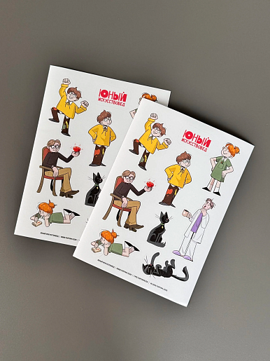 Набор состоит из 9 наклеек, посвященных главным персонажам журнала «Юный Искусствовед» — идеальный подарок для детей от 3 лет и даже взрослых!